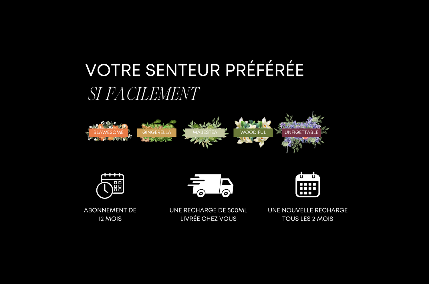 Option 2 : 1 x Recharge de 500 ml tous les 3 mois. Vous recevrez 4 recharges de 500 ml du parfum de votre choix en économisant 30 % (140€ au lieu de 200€)